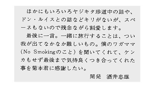 当時の社内報に、菊本さんと酒井さんがお二人でアメリカに出張されたときの旅行記が残っていました。酒井さんから菊本さんへのメッセージにじーんとしました(涙)。